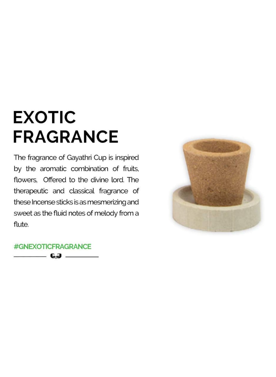 The fragrance of Gayathri Cup is inspired by the aromatic combination of fruits, flowers, haldi and kumkum offered to the divine lord. The therapeutic and classical fragrance of these Incense sticks is as mesmerizing and sweet as the fluid notes of melody from a flute.