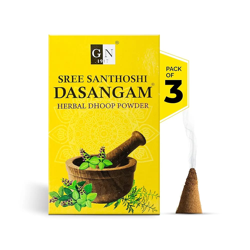 GN Sree Santhoshi Dasangam is an incense powder made from a blend of ten natural herbs and spices. It is manufactured by GN since 1917 and is used in Hindu rituals and for creating a positive, calming atmosphere.
