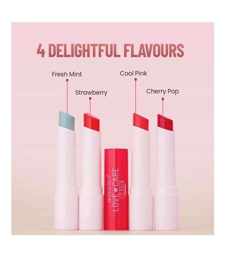 Available in 4 delightful flavours: Indulge in four delightful flavours, namely strawberry, Fresh Mint, Cool Pink, Cherry Pop that offer both a subtle tint and potent moisture for your lips
